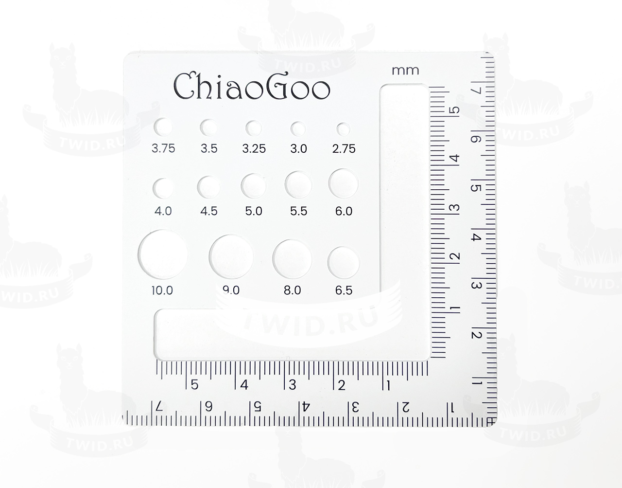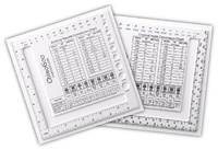 Большая линейка-калибратор: с отверстиями для измерения диаметра спиц от 1.5 до 10 мм и окошки для удобного подсчета рядов и петель в образце. Размер 14 × 14 см. Также на линейку нанесена информация по подбору размера спиц в зависимости от толщины пряжи.