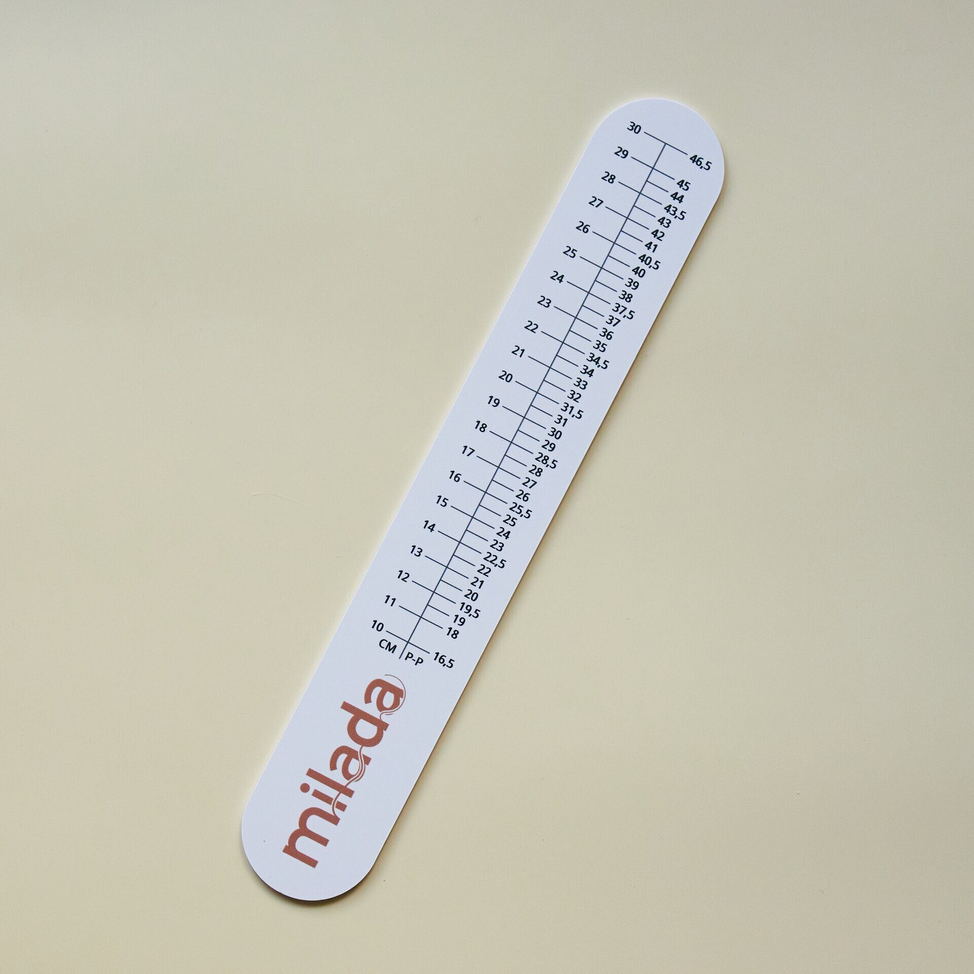 Линейка для измерения носка от Milada — удобный инструмент для измерения длины носка по стопе во время вязания. Позволяет с легкостью связать нужный размер носков (от 16.5 до 46.5 размеров).